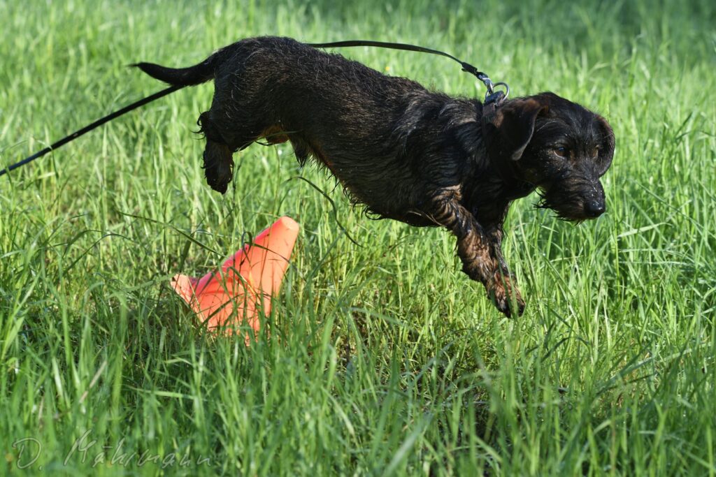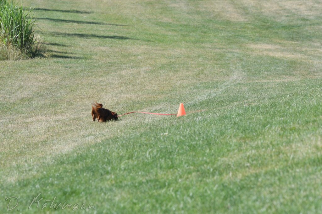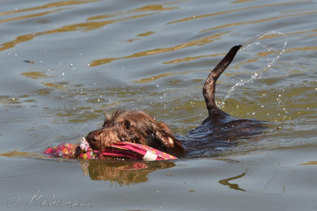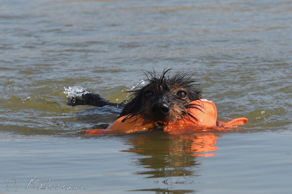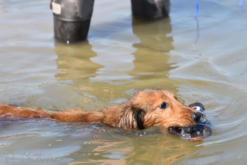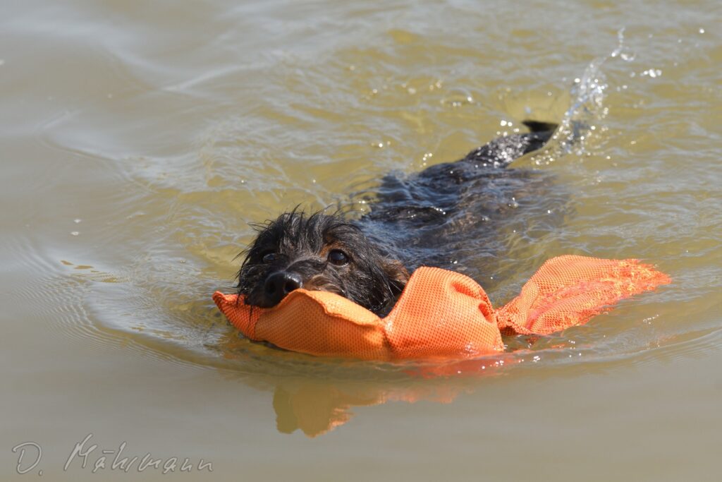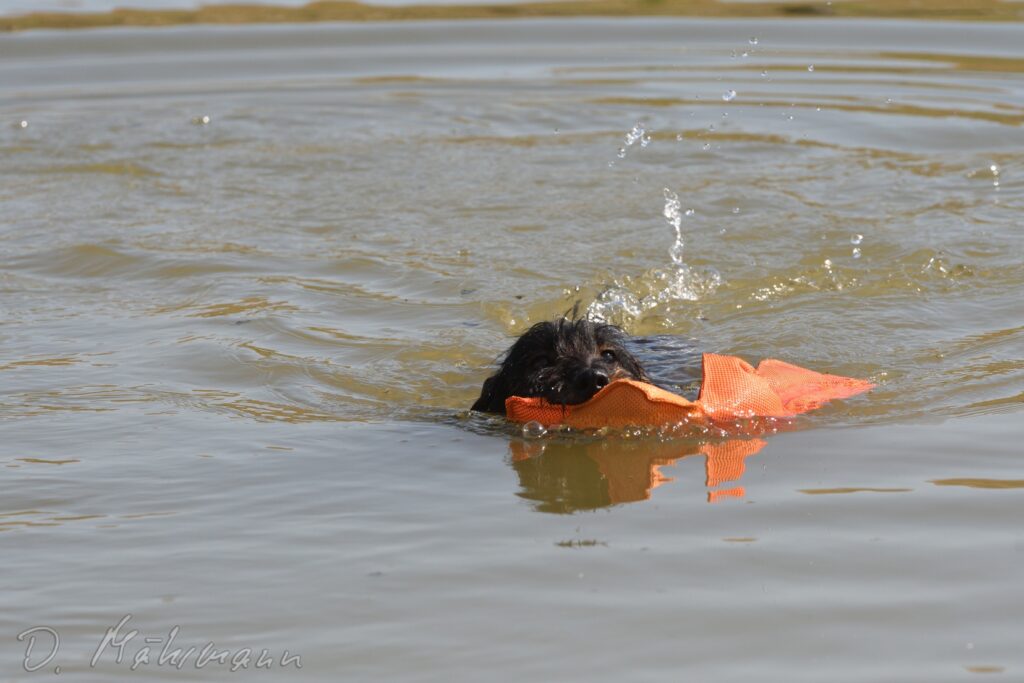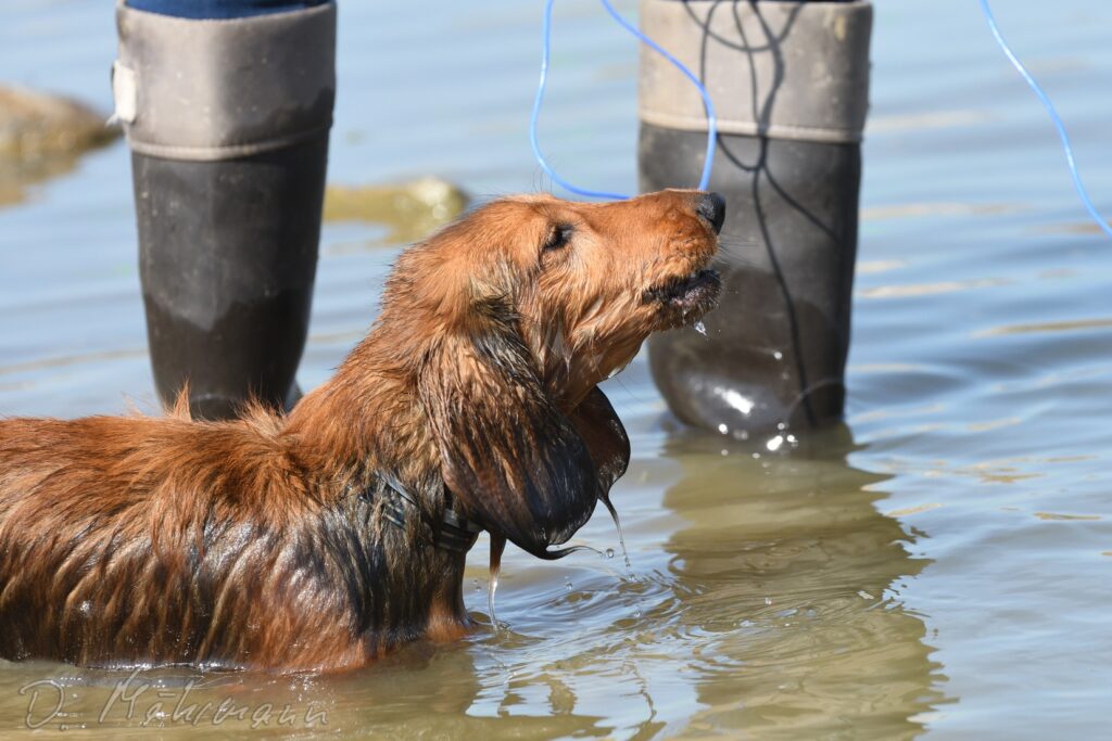 Aufgrund des heißen Wetters starteten wir an diesem Samstag schon um 8 Uhr mit unserem BHP-Kurs. Auf dem Programm stand die Hundeführersuche und die Wasserfreude. Es ging (teilweise halsbrecherisch 😉 ) durch nasse grüne Wiesen, über kurzgemähte, trockene Rasenflächen hinein ins kühle Nass. Die wassererfahrenen Teckel zeigten wie es geht, und die noch nicht so erfahrenen Hunde machten es ihnen nach.