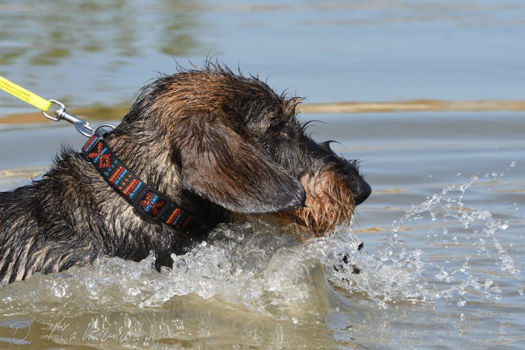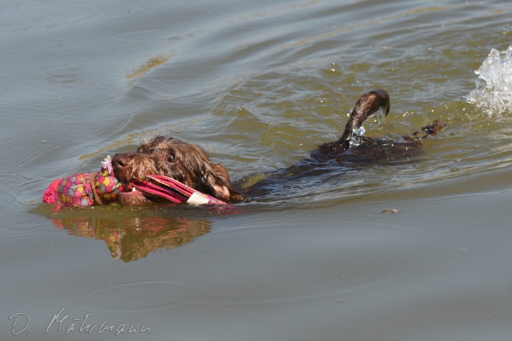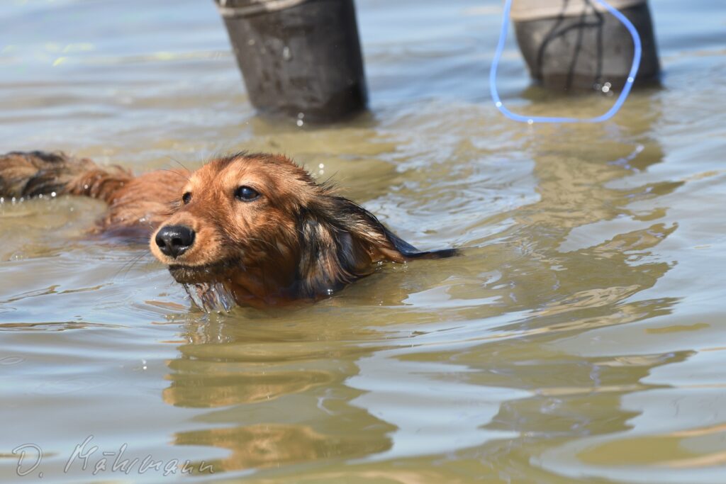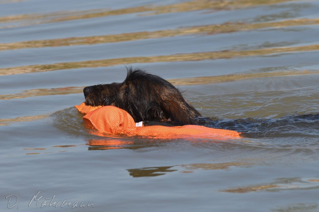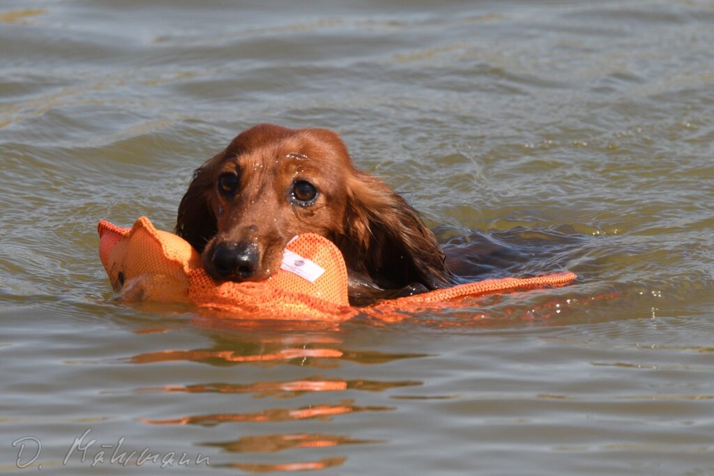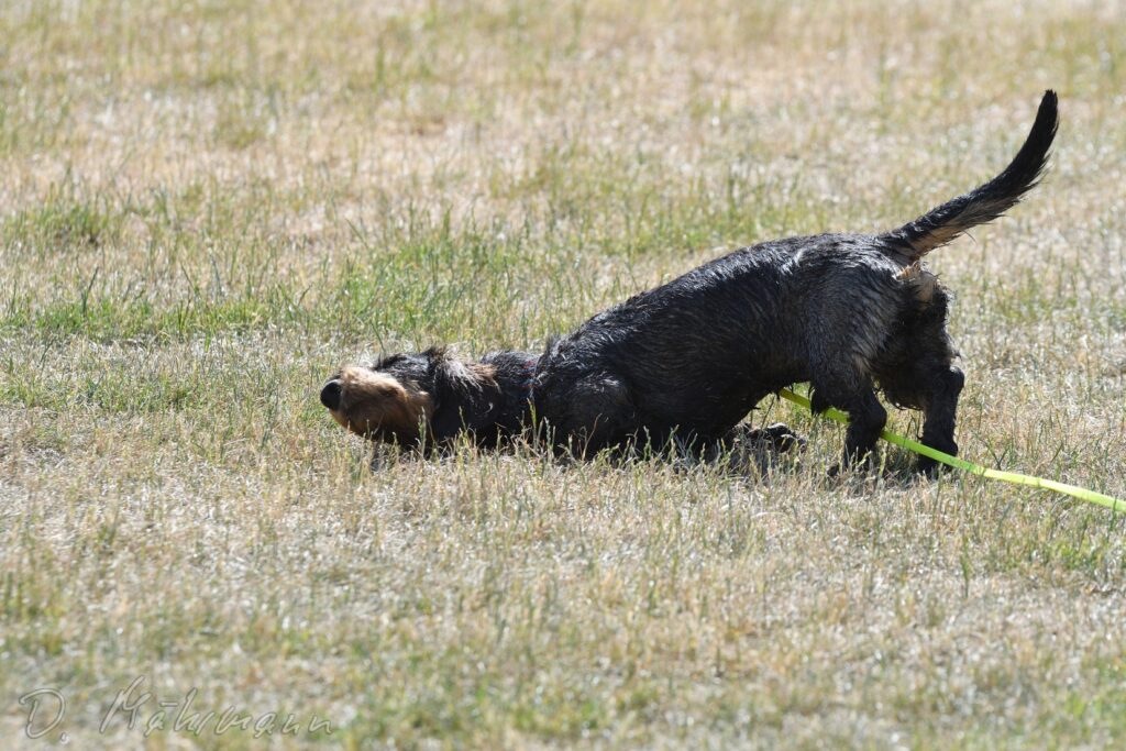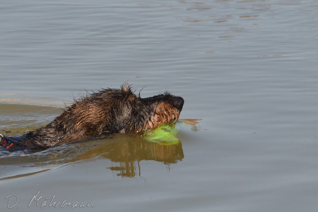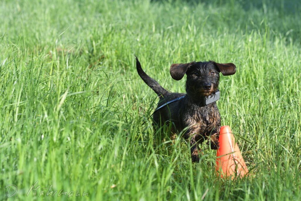Aufgrund des heißen Wetters starteten wir an diesem Samstag schon um 8 Uhr mit unserem BHP-Kurs. Auf dem Programm stand die Hundeführersuche und die Wasserfreude. Es ging (teilweise halsbrecherisch 😉 ) durch nasse grüne Wiesen, über kurzgemähte, trockene Rasenflächen hinein ins kühle Nass. Die wassererfahrenen Teckel zeigten wie es geht, und die noch nicht so erfahrenen Hunde machten es ihnen nach.